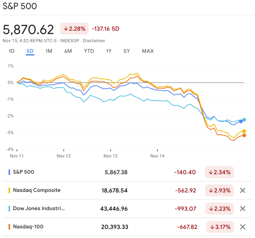 Market indices began the week with a mix of profit-taking and cautious gains, but quickly took a short dive down after the Federal Reserve Chair Jerome Powell indicated on Thursday November 14, that there were no immediate plans for further interest rate cuts.