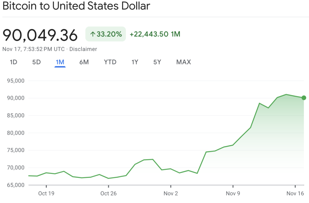 Also of note is Bitcoin’s upward trajectory, surpassing $93,000 for the first time during the week, probably thanks in part to Elon Musk’s endorsement of the meme-cryptocurrency Dogecoin, as well as continued optimistic speculative trading.