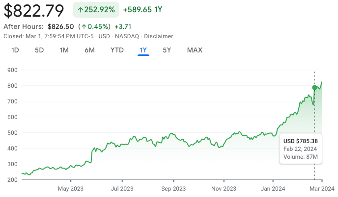 Nvidia has been largely responsible for pushing the S&P 500 to new peaks and has already risen over 235% from a year ago.